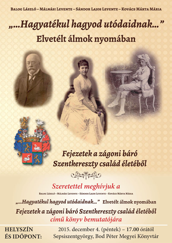 2015. december 4-én, pénteken, 17 órai kezdettel a sepsiszentgyörgyi Bod Péter Megyei Könyvtár Gábor Áron Terme lesz a helyszíne annak a könyvbemutatónak, amelynek tárgya a Balog László, Málnási Levente, Sándor Lajos Levente és Kovács Márta Mária által írt, „... Hagyatékul hagyod utódaidnak ...”. Elvetélt álmok nyomában – Fejezetek a zágoni báró Szentkereszty család életéből című könyv.