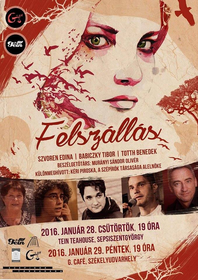 Felszállás címmel várja irodalmi estre a literatúrakedvelőket, könyvtárunk társszervezésében, a sepsiszentgyörgyi Tein teaház és kávézó 2016. január 28-án, csütörtökön 19 órára.