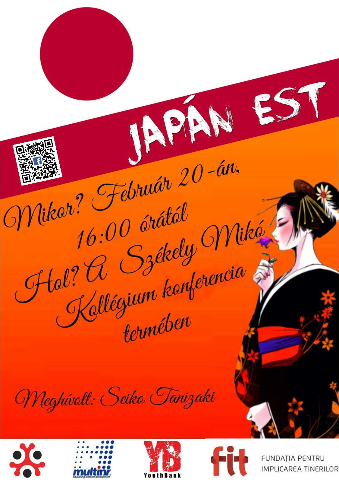 A fiatal önkéntesek Japán estre várják az érdeklődőket. Meghívottunk Seiko Tanizaki, aki előadást fog tartani a japán életmódról és kultúráról és Bán Mihály aki a japán nyelv szépségeiből tart ízelítőt. A délután során kézműves foglalkozás – kalligráfia, kvízverseny a japán életmódról és animékről, rajzverseny, jelmezverseny (cosplay) és nagyon finom Demmers teával várjuk az érdeklődőket.