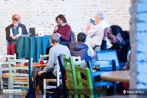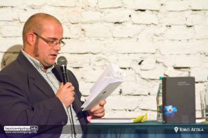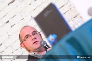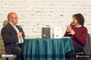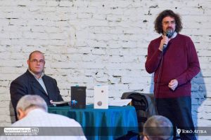 A szerzővel Szonda Szabolcs műfordító beszélget a rendezvényen.
