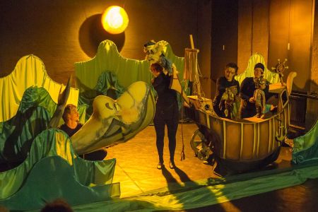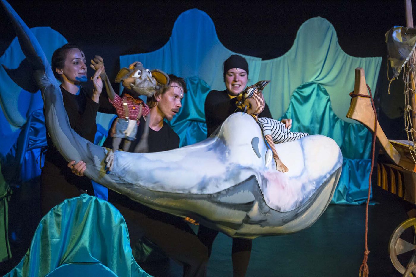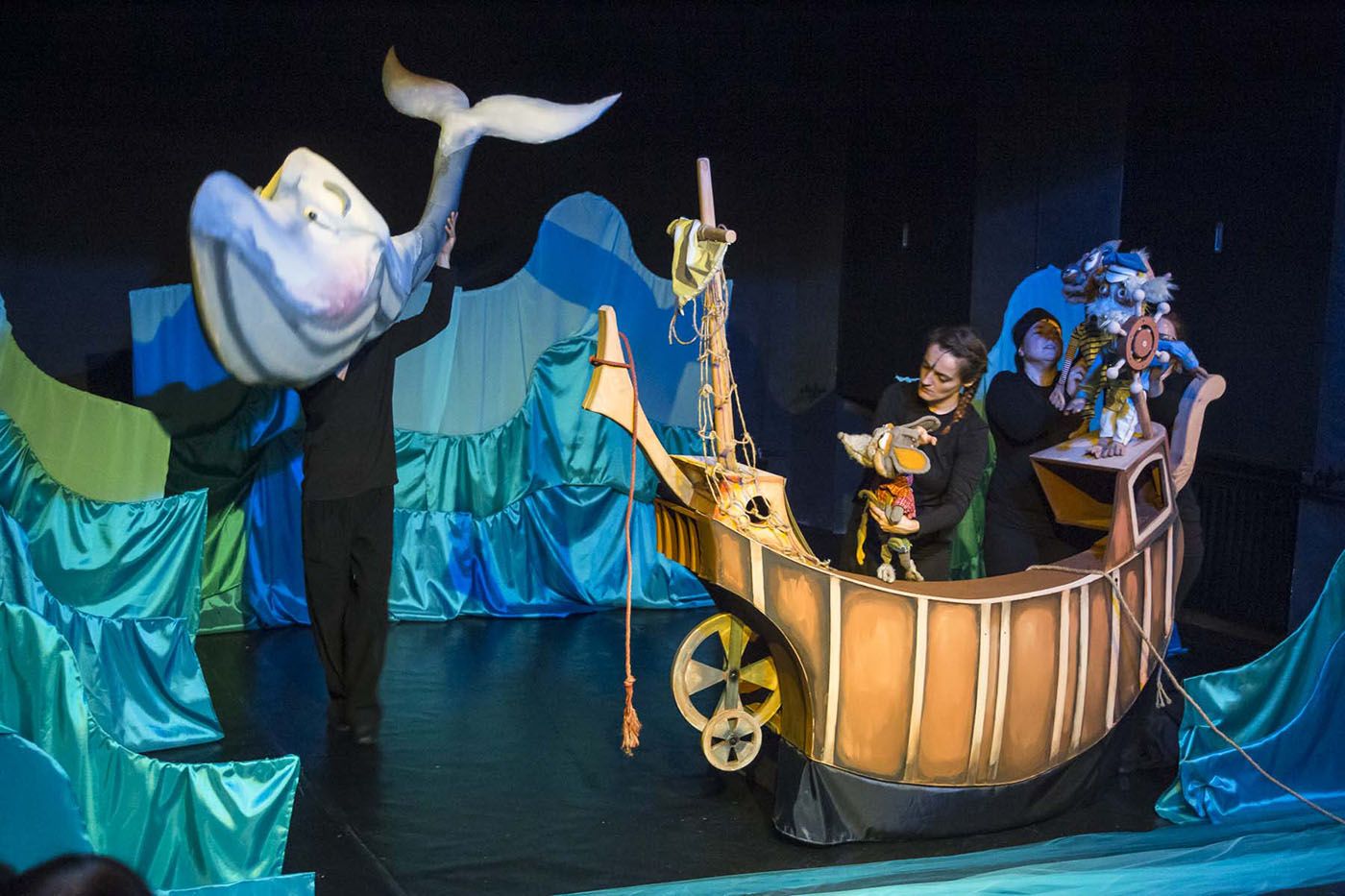 Az előadásról: Egy történet a barátságról, a felelősségvállalásról és az egymásra figyelésről. A tengeren egy hajó, melynek kéttagú legénysége, egy kutya és egy macska mindennapjait megkeseríti egy behemót bálna, aki hatalmas testével szinte menetrendszerűen felborítja a törékeny hajót, ezáltal borsot törve és károkat okozva a két tengerjáró jó barátnak. Aztán egy nap, miközben a kikötőben pihen a hajó és legénysége, potyautasként színre lép egy kisegér, aki a problémákról értesülve úgy dönt, hogy „szembeszáll” a hatalmas bálnával. Kideríti a konfliktus okát és sikeresen megoldja a helyzetet. Most már nem két jó barát szeli együtt a tengereket, hanem kiegészülve a bálnával és a kisegérrel, négyen vágnak neki az új kalandoknak. Az előadást szeretettel ajánljuk minden 4 év fölötti gyermeknek, szüleinek és nagyszüleinek!