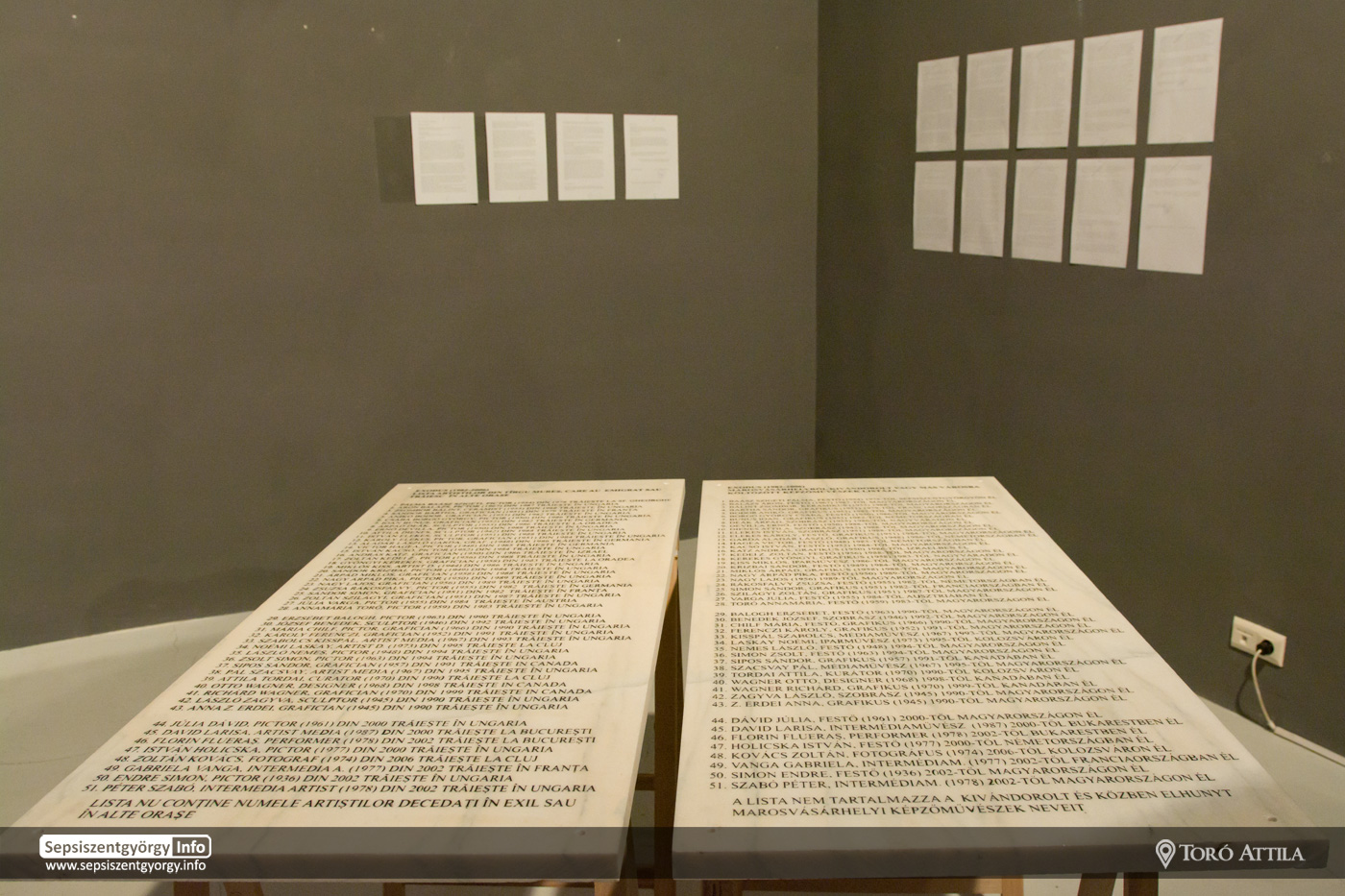 Az installáció egyrészt azt a marosvásárhelyi képzőművészeti élet helyzetét felmérő tanulmányt foglalja magába, melyet AZ UTOLSÓ ÓRA címen fogalmaztak meg és küldtek meg mintegy utolsó vészkiáltásként a helyi városi tanács figyelmébe, mely érdemben azóta sem foglalkozott a város kulturális életét érintő eme szegmensével. Folytatásként, 2017-ben végső formáját elnyerve – azonban végső helyét még nem – a mű, két nagyméretű márványtáblán (magyar és román nyelveken) sorakoztatja fel kronológiai sorrendben azon művészek nevét, akik 1982 és 2006 között „örökre” elhagyták nemcsak marosvásárhely képzőművészeti életét, de fizikailag a várost is.